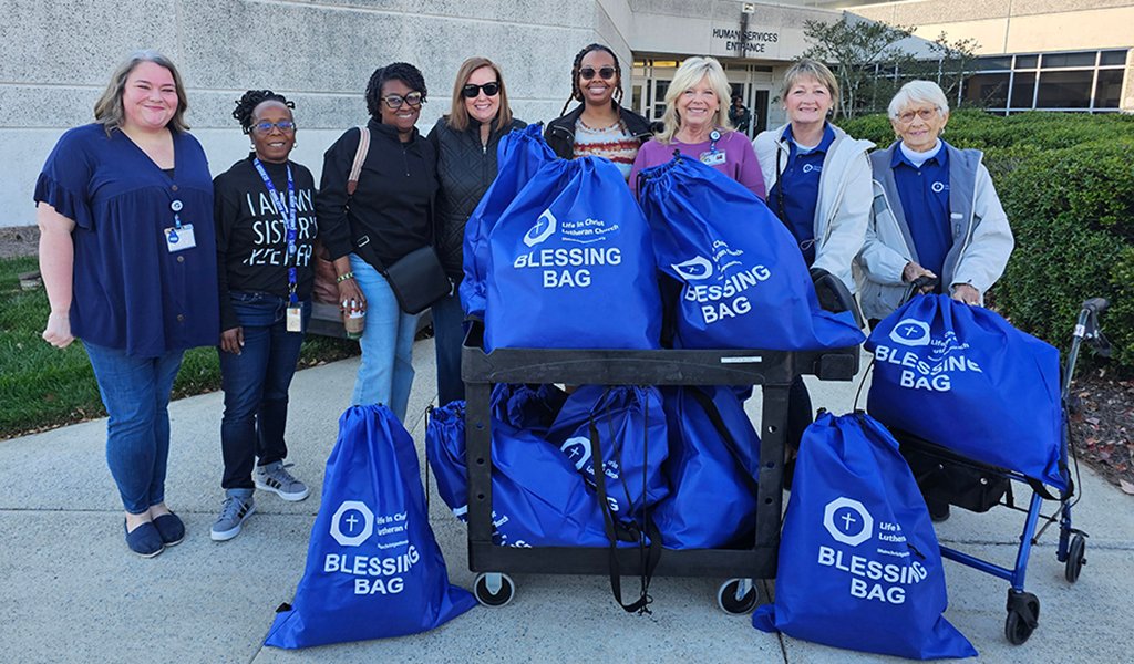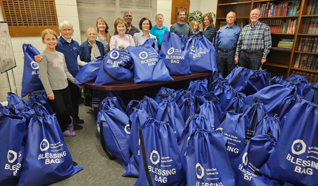 In November, members of our church packed 100 Blessing Bags for those in our community who are homeless. These heavy duty bags included a sleeping bag and pillow, hat, scarf, gloves, socks, a blanket, bottled water, snacks, a daily prayer booklet, and toiletries like toothpaste, deodorant, chapstick, a comb, shaving cream, nail clippers, and hand warmers.
